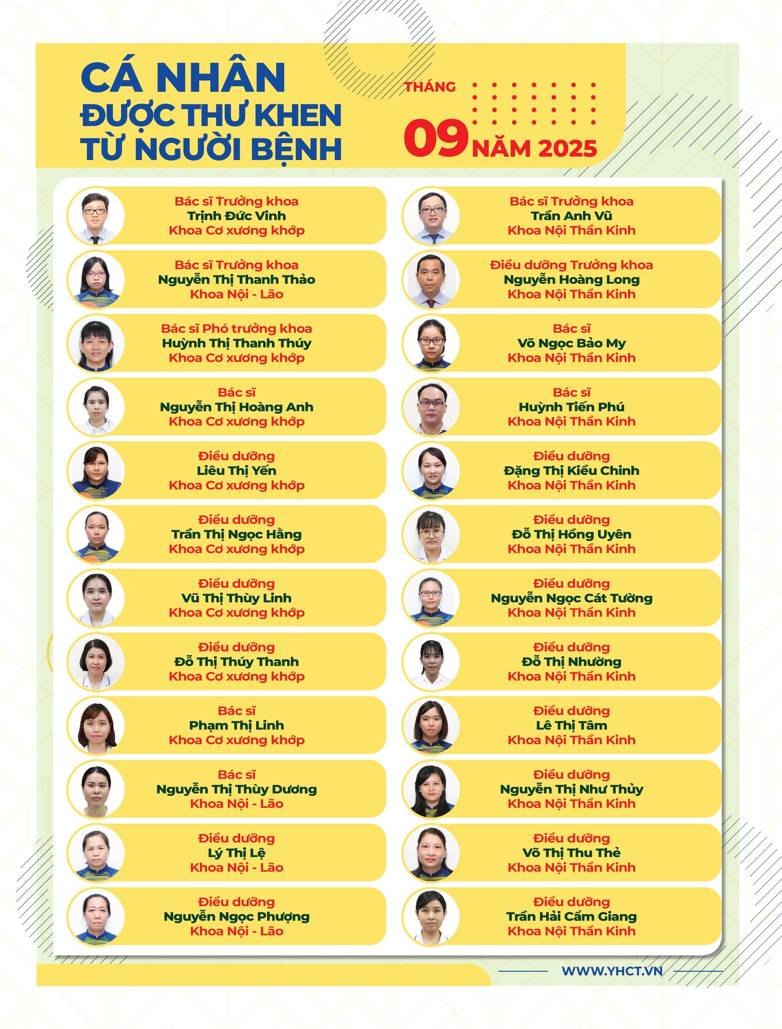 Bệnh viện Y học cổ truyền Thành phố Hồ Chí Minh công bố danh sách người đã hoàn thành quá trình thực hành khám bệnh, chữa bệnh để cấp Giấy phép hành nghề tại Bệnh viện tháng 9 năm 2025. Danh sách chi tiết theo bản đính kèm dưới đây: