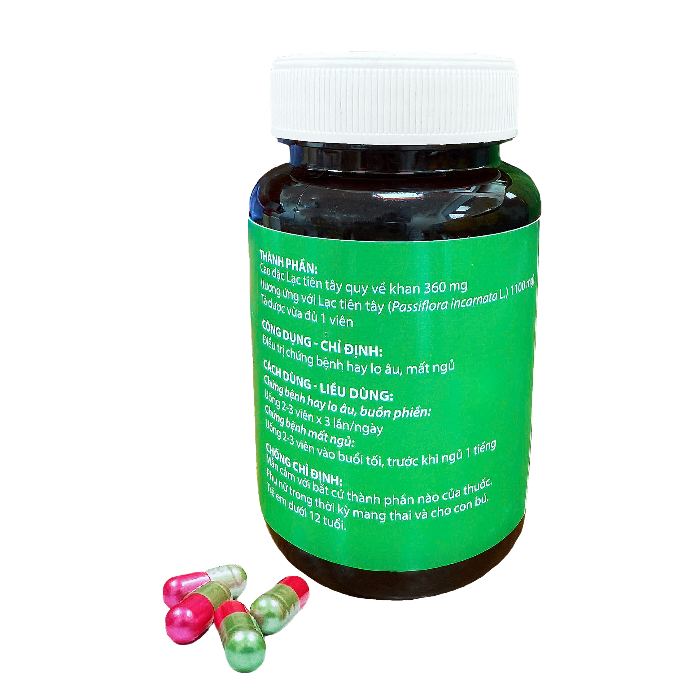 Thành phần: Cao đặc Lạc tiên tây qui về khan 360 mg(tương ứng với Lạc tiên tây 1100 mg); Lọ 60 viên nang cứng